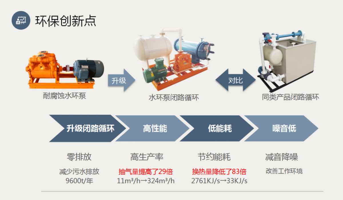 6、環(huán)保性能優(yōu)越—真空泵工作液可循環(huán)使用,耗水量低至不銹鋼同類產品的1%,可有效減少污染及其治理費用,降低運行成本。廢氣密閉輸送至回收處理系統(tǒng),杜絕廢水廢氣跑冒滴漏;